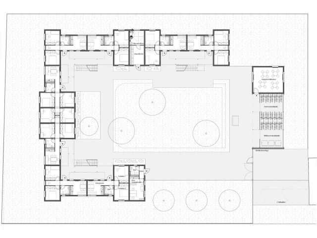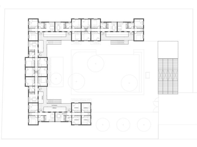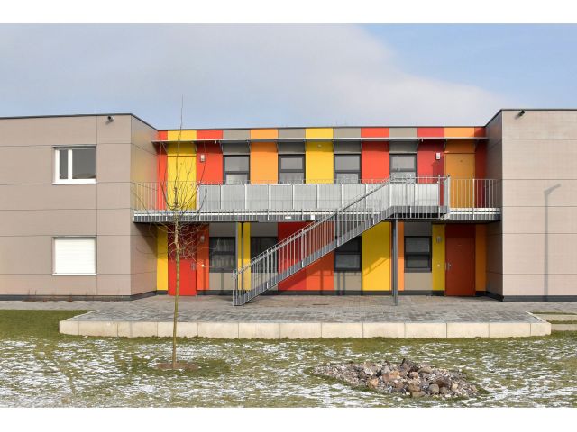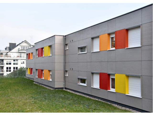 On the southeastern outskirts of the Bad Soden municipality in the Taunus mountain range, a residential building has been constructed as family housing for 80 asylum seekers. The 2-story building was built using the modular timber construction method and encompasses 16 residential units in three different sizes.