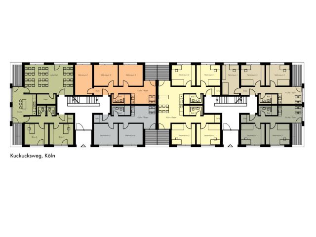 This residential concept for refugees is oriented toward subsidized housing and will be built in two locations in Cologne. It provides a structure that can be adapted to specific locations through terracing, rowing, and setback alignments. The organization of the floor plan allows for 2-, 3-, 4- and 5-room apartments. Thanks to the placement of the fuse boxes, and the ability to separate or combine different units, the apartment partitions are very flexible and can be easily adapted to meet different needs. The top-lit central circulation and the all-around orientation allows for variation without conveying the impression of“modular construction,” which can often be at odds with a sense of “being at home” and permanence. The separate flats, which feature underfloor heating and plastered walls and ceilings, consist of a bathroom, living room/kitchen area, and bedrooms. The compact bathrooms feature a walk-in shower, vanity, and toilet, and are equipped with porcelain stoneware. Each unit has a balcony.