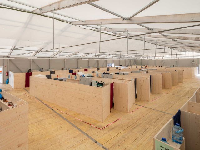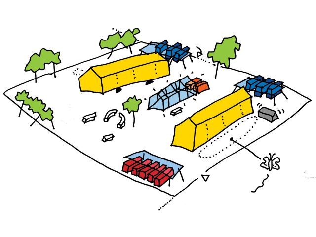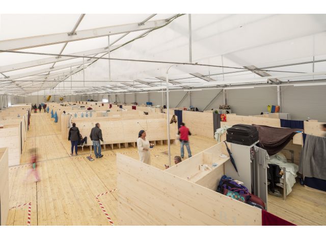 The temporary hall is a ready-made, whereas the interior was designed by an architect especially to address the challenges of mass accommodation.