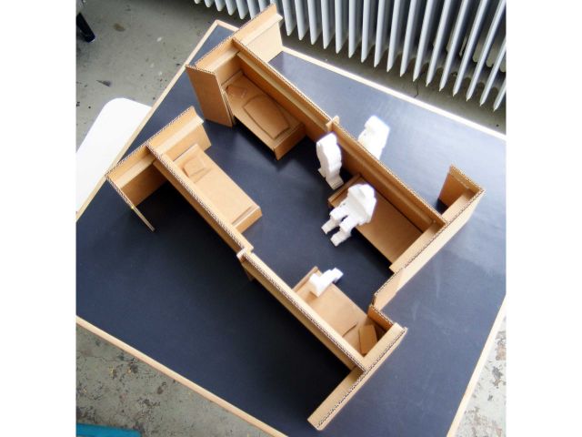 The interior design also differs significantly from other locations: a system of 1.60 metre high wooden panels was used to separate off areas for two, four and five beds. The offset arrangement formed entrance niches and avoided monotonous hallways. The main meeting places are the “loading bays” opposite the glass doors, wide sofa benches on the outsides of the sleeping areas, where mobile phones and other devices can be charged at numerous sockets. To enable the residents a maximum level of participation, on moving in they were invited to select from various curtain colours as doors to the sleeping compartments. The walls and floors made of three-ply sheets were constructed by a carpenter who is currently working under intense pressure to produce the element system for further halls: the role model is being copied. The project demonstrates how costly it is to implement a temporary location when architects insist on halfway acceptable housing. At other locations lightweight halls had to be demolished because they were unable to withstand the elements.