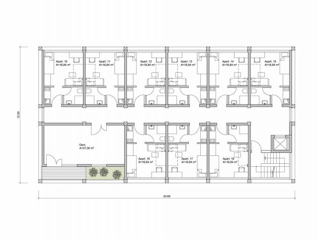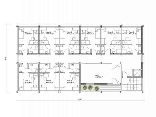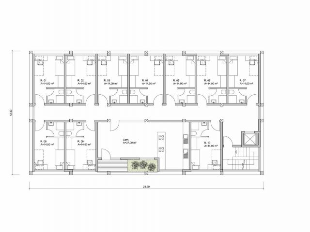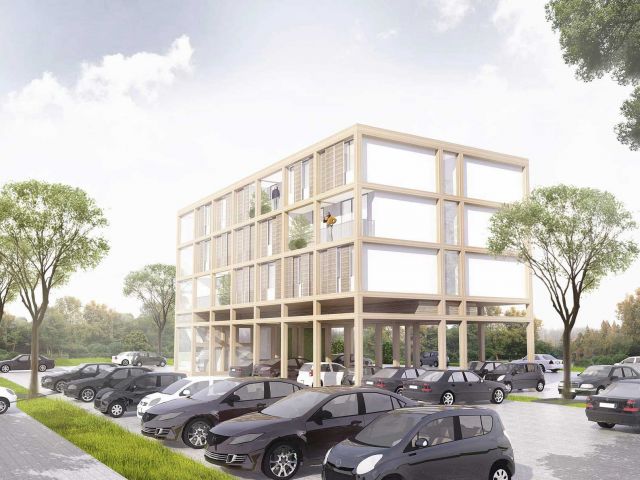 For our feasibility study, we propose to build a timber-frame prototype on the Rhein-Mosel campus of the Koblenz University of Applied Sciences. The prototype takes the form of a superstructure built over a university parking lot. The top three floors of the basement-free building feature apartments conceived for two people. A large common room is planned for each floor. The “floating” buildings have very little impact on the university campus parking lot.