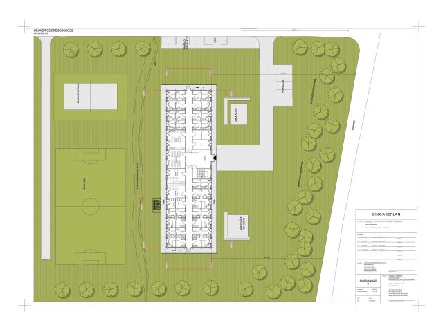 This refugee accommodation in Langenbach is a two-story timber frame structure that can house up to 78 refugees. In addition to 15-square-meter rooms designed for two people, the facility also includes a central axis, showers, bathrooms, shared kitchens, and recreation rooms. Each room features “French windows” (combination window/doors) that connect to a wraparound balcony. The design of the facade is defined by its use of blue and green fiber cement siding. The outdoor facilities include a football field and a beach volleyball court usable by both refugees and locals. Thanks to the use of easily removable drywall for the interior walls, the building can be adapted to different uses later. Such subsequent uses could range from a kindergarten, homeless shelter, student dormitory, offices, to the site of a community college or music school.