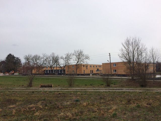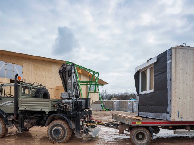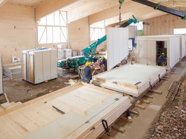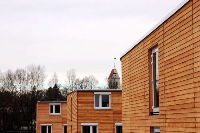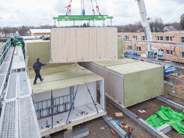 The shared accommodation employs wooden room modules that are produced and assembled directly on site