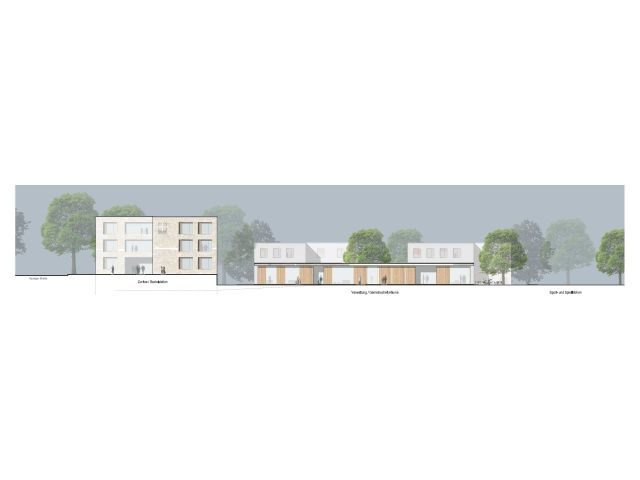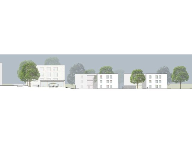 The new headquarters of the Caritas Association and its social station with its courtyard is prominently located at the existing roundabout. In the rear, set a little deeper back, a shared accommodation will be constructed facing the kindergarten. The entrance pavilion with the administration and group rooms is planned as a meeting place and neighborhood center.