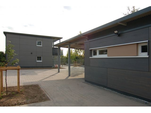 Am nördlichen Ortsrand der Gemeinde Kriftel im Taunus ist ein Wohngebäude als Familienunterkunft für 40 Asylbewerber entstanden. Das 2-geschossige Gebäude wurde in einer modularen Containerbauweise errichtet und umfasst acht Wohneinheiten in zwei unterschiedlichen Größen.