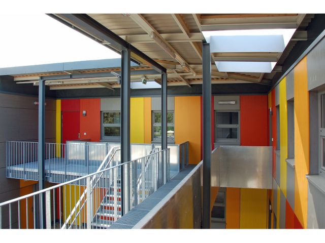 Die Gebäude wurden als 28 Container in einer Stahlrahmenbauweise zum Großteil im Werk vorgefertigt und auf die Baustelle geliefert. Der Innenausbau, die vorgehängte Holzplattenfassadenbekleidung, der Laubengang und die aufgesetzte Metalldachkonstruktion sind auf der Baustelle entstanden.