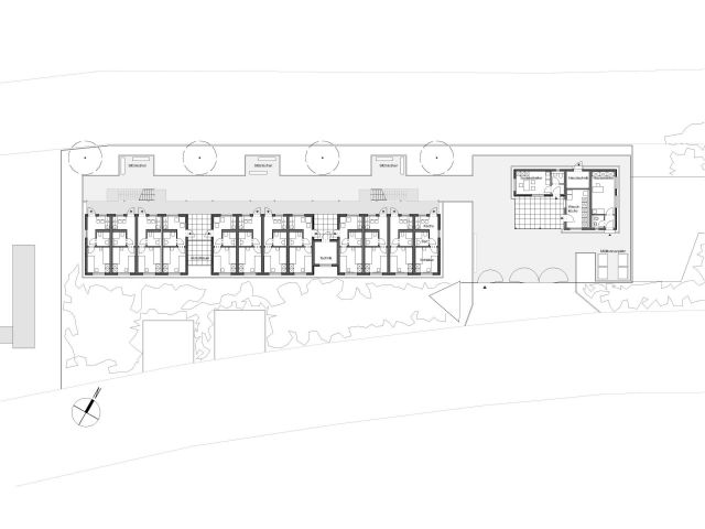 Jedes Gebäudeteil verfügt über 8 kleine Wohnungen für jeweils 2 Personen, die über einekleine Küche, ein Duschbad und einen Schlaf-/ Wohnraum verfügen.