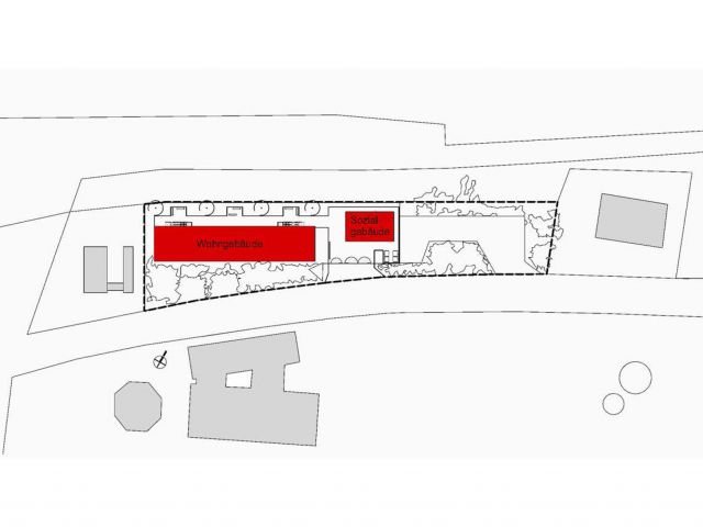Auf einem ehemaligen Parkplatzgrundstück im Gewerbegebiet der Gemeinde Flörsheim am Main ist eine Asylbewerberunterkunft für 48 Bewohner in einer modularen Fertigbauweise aus Containern entstanden. Die Unterkunft umfasst ein 2-stöckiges Wohngebäude mit einem vorgestelltem Laubengang und ein 1-stöckigs Gemeinschaftshaus mit Räumen für Sozialarbeit, Hausmeister, Waschküche und einem Haustechnikraum.