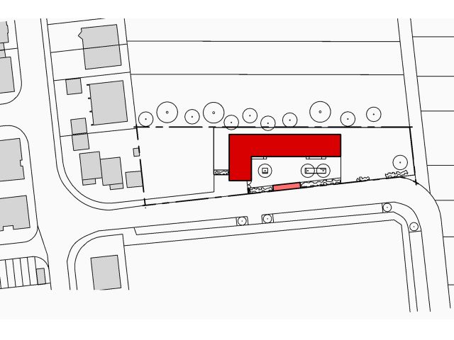 Das L-förmige Gebäude umschließt einen zentralen Innenhof, der straßenseitig durch die Mülltonnen-/ Fahrradbox und einen Pflanzstreifen begrenzt wird. Die Erschließung des Wohngebäudes erfolgt über zwei Laubengänge, von denen im Obergeschoss jeweils 2 bzw. 3 Wohneinheiten abgehen.