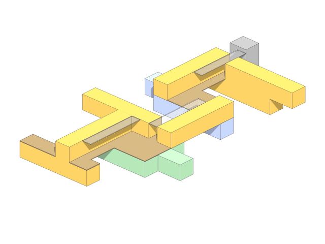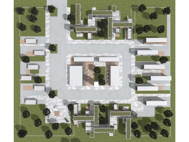 Die Grundmodule werden zu einer Siedlungsstruktur zusammengesetzt. Es werden Gärten, Vorgärten, multifunktionale Gemeinschaftsbereiche, zentrale Plätze, Kinderspielplätze und Lagerflächen gebildet.