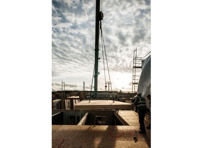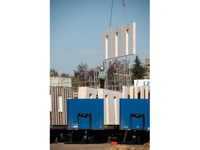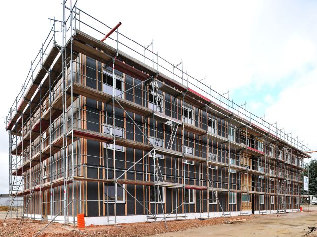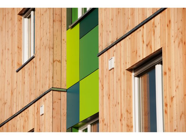 Ein weiteres Beispiel eines vorgefertigten Holzbaus für Flüchtlinge: Das 3-geschossige Gebäude für 200 Bewohner wurde nach einer Planungsphase von drei Wochen und einer Bauzeit von vier Monaten fertiggestellt.