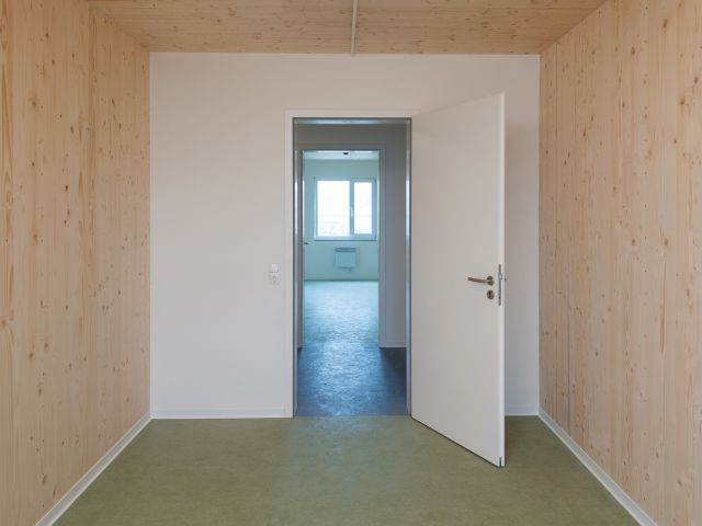 In kürzester Bauzeit wurde eine Erstaufnahmeeinrichtung mit hoher Bau- und Materialqualität in verdichteter Bauweise errichtet. Die Planungsphase des 3-geschossigen Gebäudes betrug drei Wochen, die Bauzeit vier Monate. Das Gebäude (33m lang, 15m breit, 9m hoch) wurde aus vorgefertigten Elementen in Holztafelbauweise (Raster Module 3x6m) errichtet. Im Innen- und Außenbereich wurden heimische Hölzer eingesetzt. Es wird eine Nachnutzung als Hostel oder Büro angestrebt.