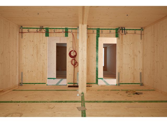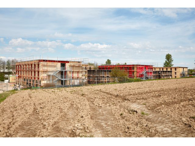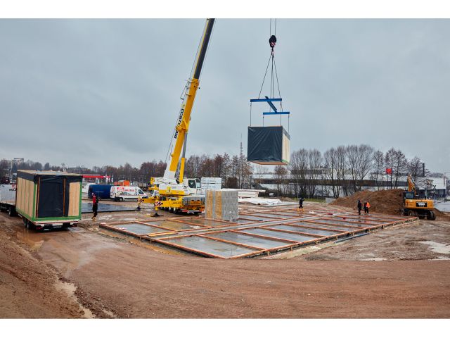 Als Antwort auf dem Bedarf nach schnell realisierbarem Wohnungsbau für die Flüchtlingskrise wurden vorgefertigte Raummodule aus Holz gewählt.
