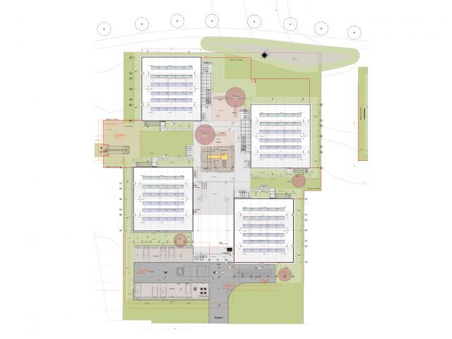 In der Anlage mit insgesamt 5 Gebäuden befinden sich Unterkünfte für 164 Flüchtlinge, Gemeinschaftsräume, Büroräume und Verwaltung. Der Energieverbrauch wird von Photovoltaikanlagen unterstützt.