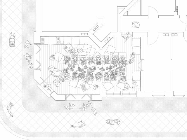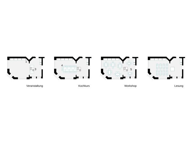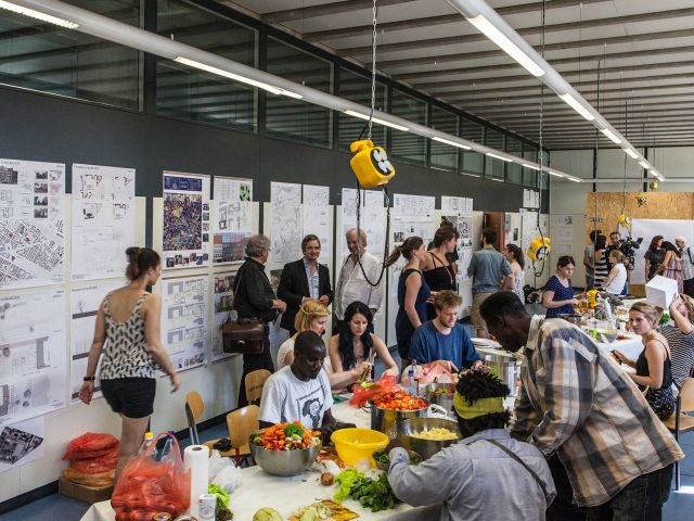 Entstanden ist eine zentrale Kochinsel, die zu einer großen Tafel erweitert werden kann. Durch ein Baukastensystem können die Tische entweder in Stand- oder Sitzhöhe genutzt werden, nicht benötigte Elemente werden in einem Wandregal verstaut. Neben dem Kochen, sollen in dem 55 Quadratmeter großen Küchenraum verschiedene Tätigkeiten möglich sein. Mit dem modularen Einrichtungssystem lässt sich der Raum multifunktional nutzen, zum Beispiel auch für Workshops, Diskussionsrunden oder Nachbarschaftstreffen.