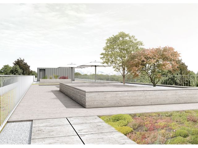 Die Wohnungen werden von den Treppenhäusern aus über Laubengänge erschlossen. Vor jeweils drei Wohnungen ist der Laubengang zu einer kleinen Nische, die möbliert werden kann und als Treffpunkt für die Bewohner dient, ausgeweitet. Die meisten Wohnungen sind Einzimmerappartements, aber auch 2 ½ Zimmer-Wohnungen stehen zur Verfügung. Als zusätzliches Angebot für die Bewohner gibt es Gemeinschaftsräume, ein Waschcafé und eine schöne Dachterrasse mit Spielflächen, Liegedecks, aber auch der Möglichkeit Gemüse und Kräuter anzupflanzen.