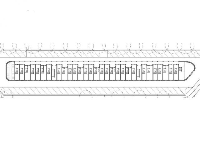 Um die meisten der vorhandenen Parkplätze erhalten zu können, wird zunächst eine Konstruktion aus Stahlbetonstützen und Unterzügen gebaut, auf der dann die eigentliche Wohnbebauung als Holzkonstruktion errichtet wird. Das Haus berührt nur mit zwei Treppenhäusern und den beiden Kopfbauten, in denen Technik, Lager und Müllräume untergebracht sind, den Grund.