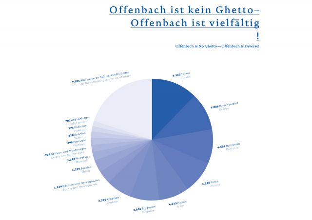 Offenbach hat eine lange Tradition der Immigration. Funktional ist die Stadt ein »Ankunftsbezirk« im Zentrum von Frankfurt/Rhein-Main, einer globalen Metropolregion mit einem hohen Immigrationsanteil. In der Bevölkerung sind 159 Nationen vertreten.
